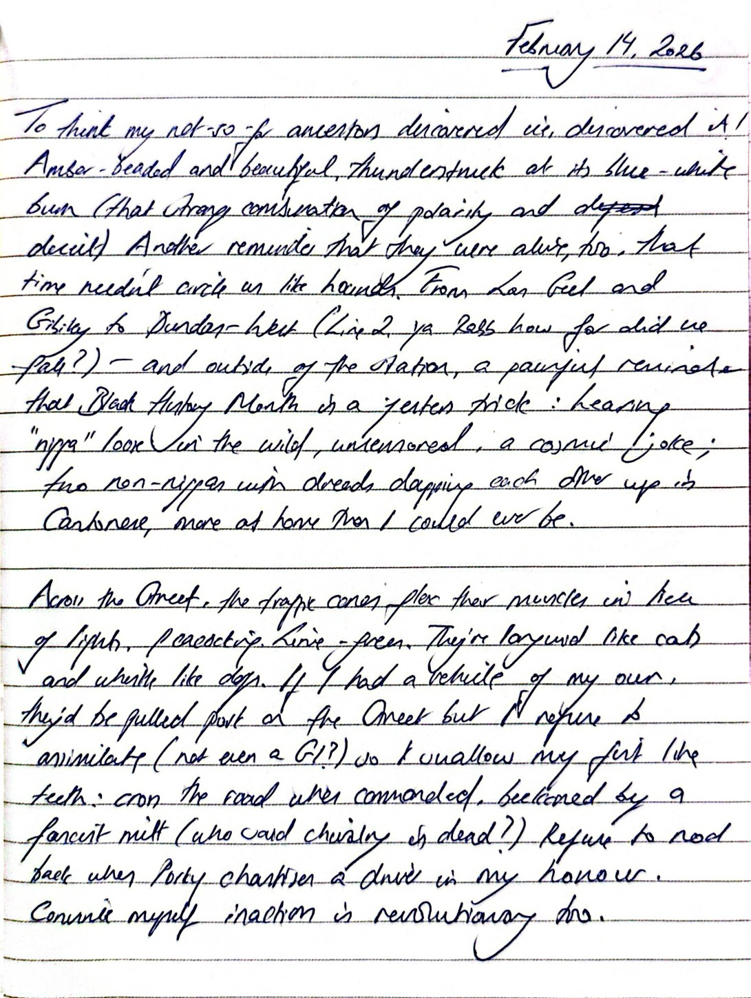 To think my not-so-far ancestors discovered ice, discovered it! Amber-beaded and beautiful, thunderstruck at its blue-white burn (that strange combination of polarity and deceit). Another reminder that they were alive, too, that time needn’t circle us like hounds. From Las Geel and Gibiley to Dundas-West (Line 2, ya Rabb, how far did we fall?) — and outside of the station, a painful reminder that Black History Month is a jester’s trick: hearing “nigga” loose in the wild, uncensored, a cosmic joke; two non-niggas with dreads dapping each other up in Cantonese, more at home than I could ever be.
